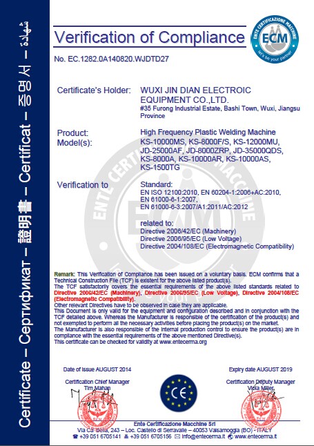 金電企業(yè)針對高頻機(jī)(高周波塑膠熔接機(jī))設(shè)備申請CE認(rèn)證主要做了MD(機(jī)械指令)、LVD(低電壓指令)以及EMC(電磁兼容指令)適合目前歐盟市場需求,為更好發(fā)展國際市場打好基礎(chǔ)。